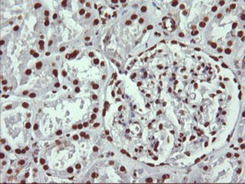 Immunohistochemical staining of paraffin-embedded Human Kidney tissue within the normal limits using anti-THUMPD1 mouse monoclonal antibody. (Heat-induced epitope retrieval by 10mM citric buffer, pH6.0, 120°C for 3min, BD-PE3995)