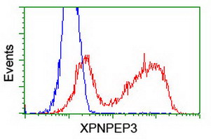 HEK293T cells transfected with either overexpress plasmid (Red) or empty vector control plasmid (Blue) were immunostained by anti-XPNPEP3 antibody (BD-PE4472), and then analyzed by flow cytometry.