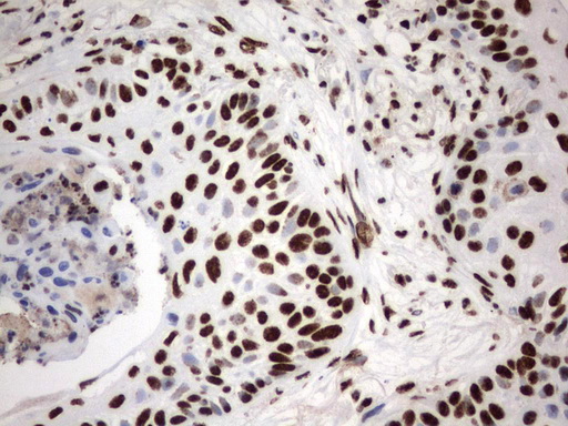 Immunohistochemical staining of paraffin-embedded Carcinoma of Human lung tissue using anti-MLF1 mouse monoclonal antibody. (BD-PE4505, heat-induced epitope retrieval by 1mM EDTA in 10mM Tris, pH8.0, 120°C for 3min)