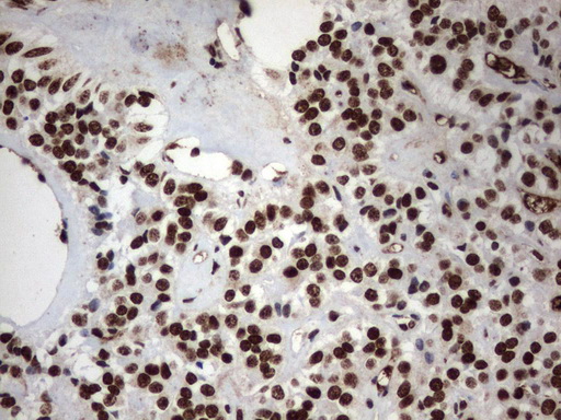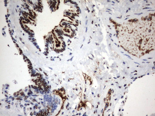Immunohistochemical staining of paraffin-embedded Carcinoma of Human prostate tissue using anti-MLF1 mouse monoclonal antibody. (BD-PE4505, heat-induced epitope retrieval by 1mM EDTA in 10mM Tris, pH8.0, 120°C for 3min)