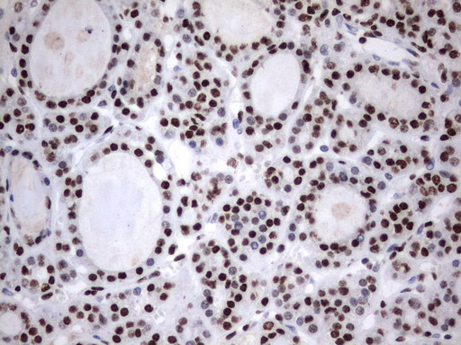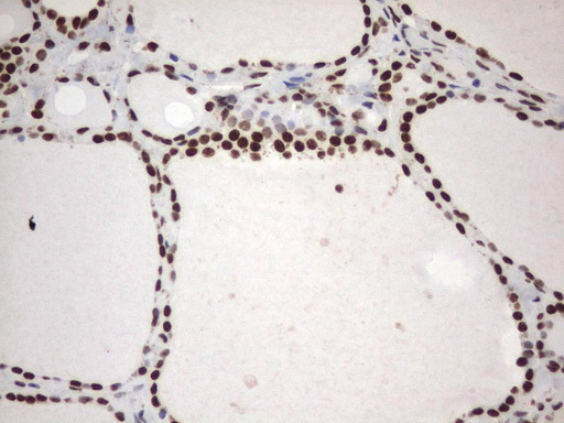 Immunohistochemical staining of paraffin-embedded Human thyroid tissue using anti-MLF1 mouse monoclonal antibody. (BD-PE4505, heat-induced epitope retrieval by 1mM EDTA in 10mM Tris, pH8.0, 120°C for 3min)
