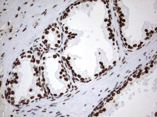 Immunohistochemical staining of paraffin-embedded Human prostate tissue using anti-MLF1 mouse monoclonal antibody. (BD-PE4505, heat-induced epitope retrieval by 1mM EDTA in 10mM Tris, pH8.0, 120°C for 3min)