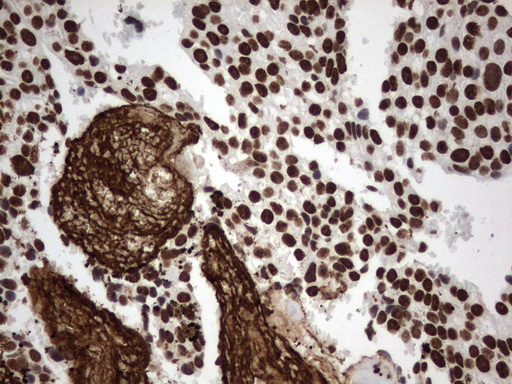 Immunohistochemical staining of paraffin-embedded Carcinoma of Human thyroid tissue using anti-MLF1 mouse monoclonal antibody. (BD-PE4505, heat-induced epitope retrieval by 1mM EDTA in 10mM Tris, pH8.0, 120°C for 3min)