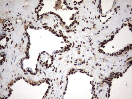 Immunohistochemical staining of paraffin-embedded Human lung tissue using anti-MLF1 mouse monoclonal antibody. (BD-PE4505, heat-induced epitope retrieval by 1mM EDTA in 10mM Tris, pH8.0, 120°C for 3min)
