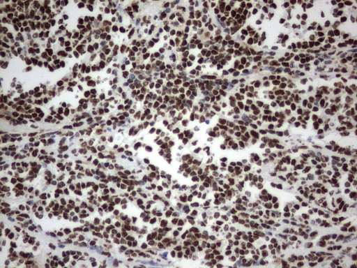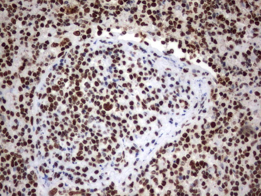 Immunohistochemical staining of paraffin-embedded Human lymphoma tissue using anti-MLF1 mouse monoclonal antibody. (BD-PE4505, heat-induced epitope retrieval by 1mM EDTA in 10mM Tris, pH8.0, 120°C for 3min)