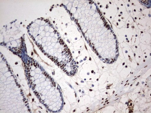 Immunohistochemical staining of paraffin-embedded Human colon tissue using anti-MLF1 mouse monoclonal antibody. (BD-PE4505, heat-induced epitope retrieval by 1mM EDTA in 10mM Tris, pH8.0, 120°C for 3min)