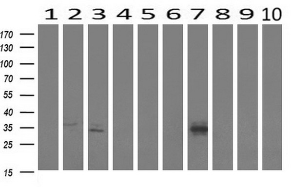 Western blot analysis of extracts (10ug) from 10 Human tissue by using anti-MLF1 monoclonal antibody at 1:500 (1: Testis; 2: Omentum; 3: Uterus; 4: Breast; 5: Brain; 6: Liver; 7: Ovary; 8: Thyroid gland; 9: colon;10: spleen).