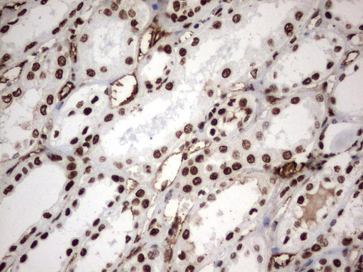 Immunohistochemical staining of paraffin-embedded Human Kidney tissue using anti-MLF1 mouse monoclonal antibody. (BD-PE4505, heat-induced epitope retrieval by 1mM EDTA in 10mM Tris, pH8.0, 120°C for 3min)