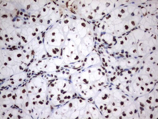 Immunohistochemical staining of paraffin-embedded Carcinoma of Human kidney tissue using anti-MLF1 mouse monoclonal antibody. (BD-PE4505, heat-induced epitope retrieval by 1mM EDTA in 10mM Tris, pH8.0, 120°C for 3min)