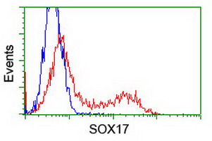 HEK293T cells transfected with either overexpress plasmid (Red) or empty vector control plasmid (Blue) were immunostained by anti-SOX17 antibody (BD-PE4507), and then analyzed by flow cytometry.