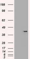 HEK293T cells were transfected with the pCMV6-ENTRY control (Left lane) or pCMV6-ENTRY SOX17 (Right lane) cDNA for 48 hrs and lysed. Equivalent amounts of cell lysates (5 ug per lane) were separated by SDS-PAGE and immunoblotted with anti-SOX17(Cat# BD-PE4507). Positive lysates (100ug) and (20ug) can be purchased separately from OriGene.