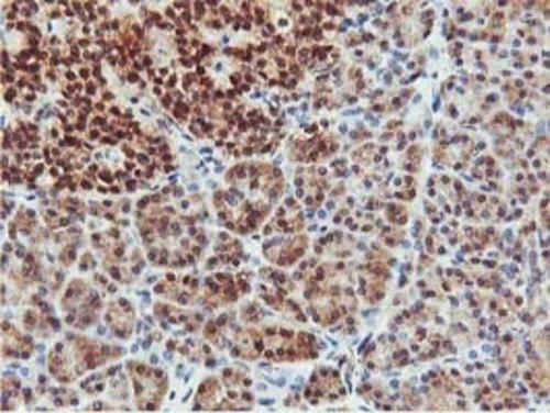 Immunohistochemical staining of paraffin-embedded Human pancreas tissue within the normal limits using anti-COASY mouse monoclonal antibody. (Heat-induced epitope retrieval by 10mM citric buffer, pH6.0, 100°C for 10min, BD-PE4712)