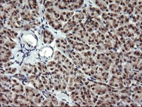 Immunohistochemical staining of paraffin-embedded Human pancreas tissue within the normal limits using anti-MAP2K2 mouse monoclonal antibody. (Heat-induced epitope retrieval by 10mM citric buffer, pH6.0, 120°C for 3min, BD-PE4738)