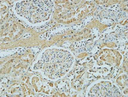 Immunohistochemical analysis of paraffin-embedded Human Right kidney. 1, Antibody was diluted at 1:100(4°,overnight). 2, High-pressure and temperature EDTA, pH8.0 was used for antigen retrieval. 3,Secondary antibody was diluted at 1:200(room temperature, 30min).