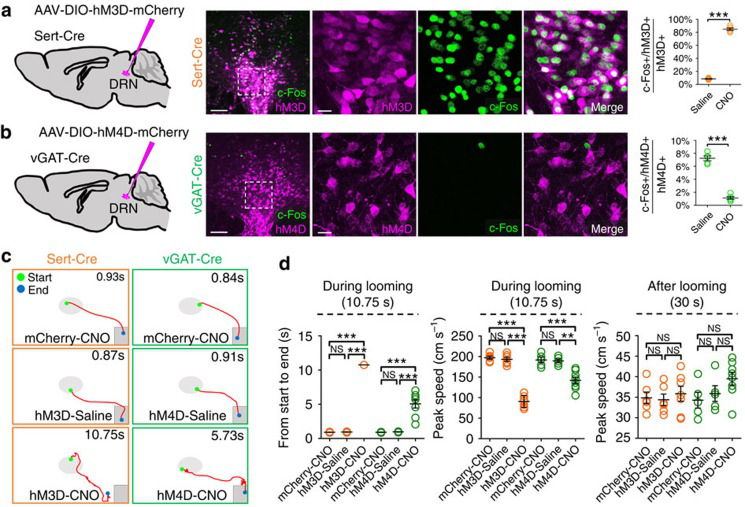 图3.视网膜缝神经元对防御行为的调控(Chaoran Ren, et al.,Nature Communication, 2017)