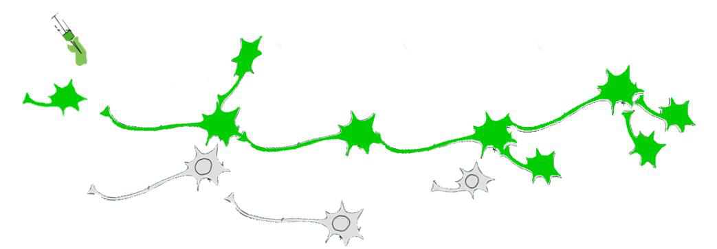 野生PRV的分离株(Becker株)毒性较大,在神经环路传播过程中,既可以顺突触传播,又可以逆突触传播。基于PRV Bartha疫苗株构建的重组示踪工具病毒,能够严格逆向跨多突触标记神经网络。病毒感染神经细胞后,在胞内复制并表达目的基因,子代病毒运输到突触后,逆向跨突触进入上游神经元,开始新一轮的复制及逆向跨突触传播等过程。