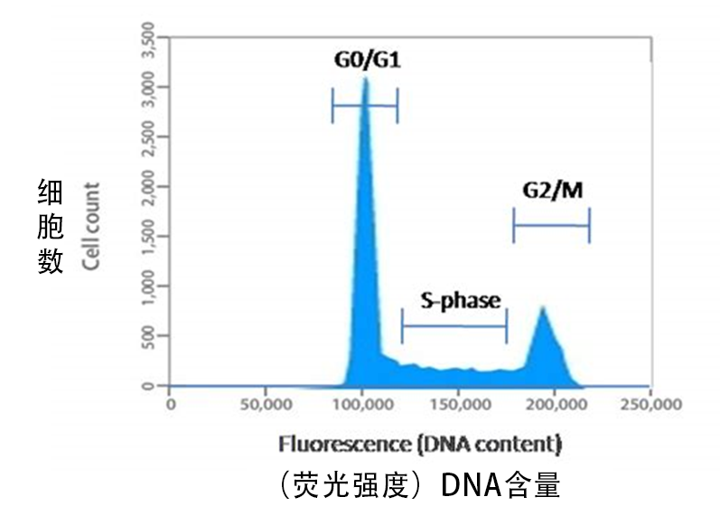 细胞周期(cell cycle)是指细胞从一次分裂完成开始到下一次分裂结束所经历的全过程,分为间期与分裂期两个阶段。细胞周期反应了细胞增殖速度。PI(碘化丙锭):可以与细胞内DNA和RNA结合,采用RNA酶将RNA消化后,通过流式细胞术检测到的与DNA结合的PI的荧光强度直接反映了细胞内DNA含量的多少。