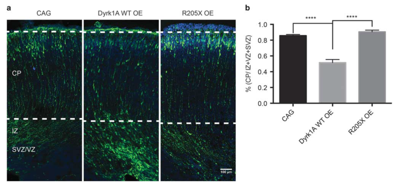 慢病毒载体搭载的Dyrk1α段发卡RNA(shRNA)干扰新生小鼠皮层的发育和神经元的迁移。(Dang, T , et al. Molecular Psychiatry . 2017)