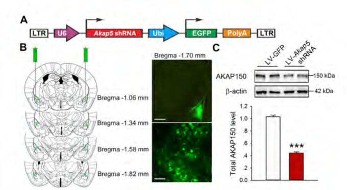 慢病毒搭载shRNA后干扰小鼠杏仁核内Akap5的表达,下调小鼠脑内BLA中Akap5的含量,可有效缓解小鼠出现慢性束缚造成的焦虑/抑郁样行为。(Zhou et al., Biol Psychiatry. 2019)