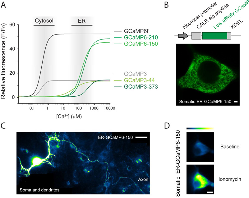 Lenti-ER-GCaMP6超敏内质网ER Ca2+指示剂,清楚显示了胞体延申至树突及整个轴突网络。(De Juan-Sanz J , Holt G T , Schreiter E R , et al. Neuron, 2017.)