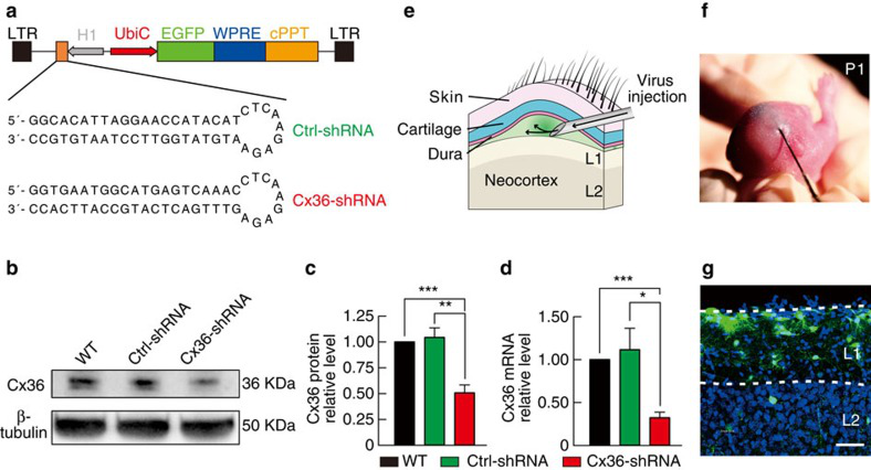 诱导型慢病毒shRNA有效介导Conne-xin 36敲减。将病毒注射到新生P1小鼠的硬脑膜和皮质层的间隙(e.f),P15小鼠中观察到GFP+主要分布在L1,在深层的分布较少。(Yao X H , Wang M , He X N , et al., Nature Communications, 2016)
