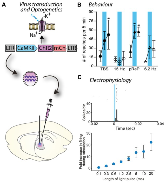 慢病毒表达光敏感离子通道蛋白(ChR2)的神经元经蓝光刺激后细胞行为的改变。(LC Parr-Brownlie et al., Front. Mol.Neurosci,2015)