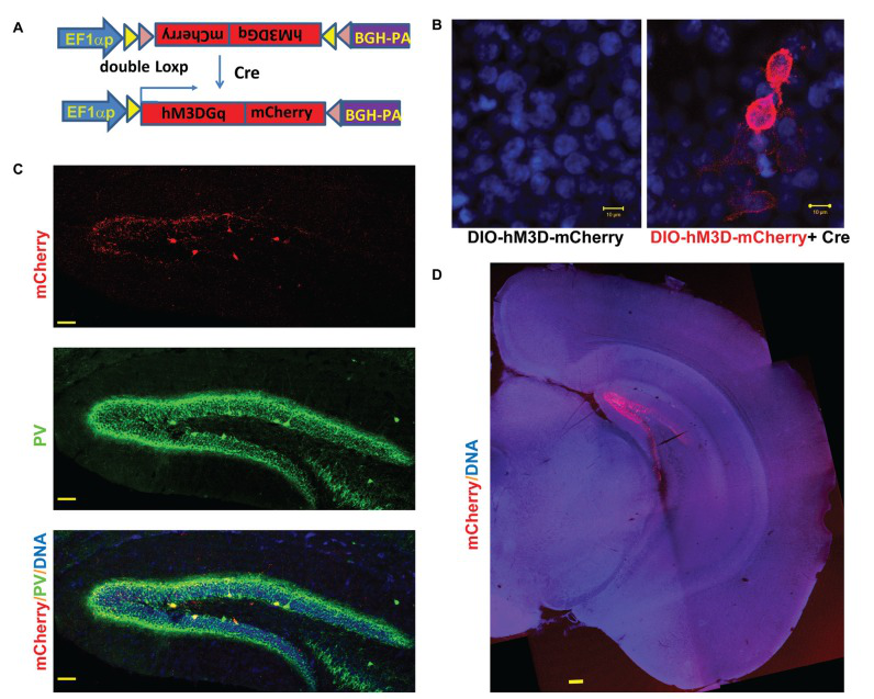 LV-hM3Dq研究PV中间神经元。DREADDr e c e p t o r h M 3 D q 在PV(Parvalbumin,Green)阳性中间神经元内表达。在小鼠海马注射 LVhEF1α-DIO-hM3D-GqmCherry,两周后在脑片中观察到海马hM3D-Gq(Red) 和PV (Green)的表达。( Zou et al. Curr MolMed. 2016)