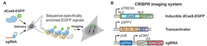 LV-dCas9 和LV-sgRNA用于哺乳动物细胞基因组位点成像。(Baohui Chen et al., Cell, 2013)
