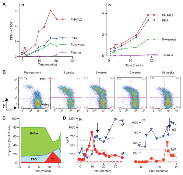 接受SIN-LV治疗后,SCID-X1病人T细胞和B细胞的功能改善。密码子优化的 Self-inactivating element LV,即SIN-LV(Cl20-i4-Ef1a-hγcOPT) 转导CD34+ HSC后回输给病人。上图显示病人的CD3T 细胞能够响应药物刺激增殖(A),治疗后的12-16周,病人出现 T1B cells(CD10++CD21lo)向T2/3 B cells+hi (CD10++CD21lo)的转变,免疫细胞类群构成多样性增加。(De Ravin et al.,Sci Transl Med, 2016)