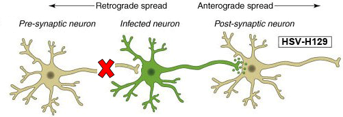 图1. HSV-H129株特异顺向跨突触传播示意图