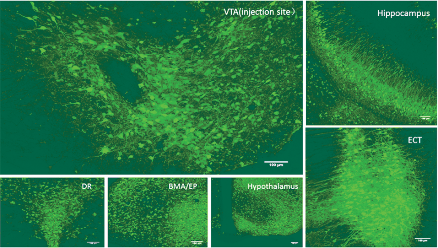 图2. 利用rH129-EGFP标记小鼠腹侧被盖区(VTA的输出神经环路Science at WIPM)