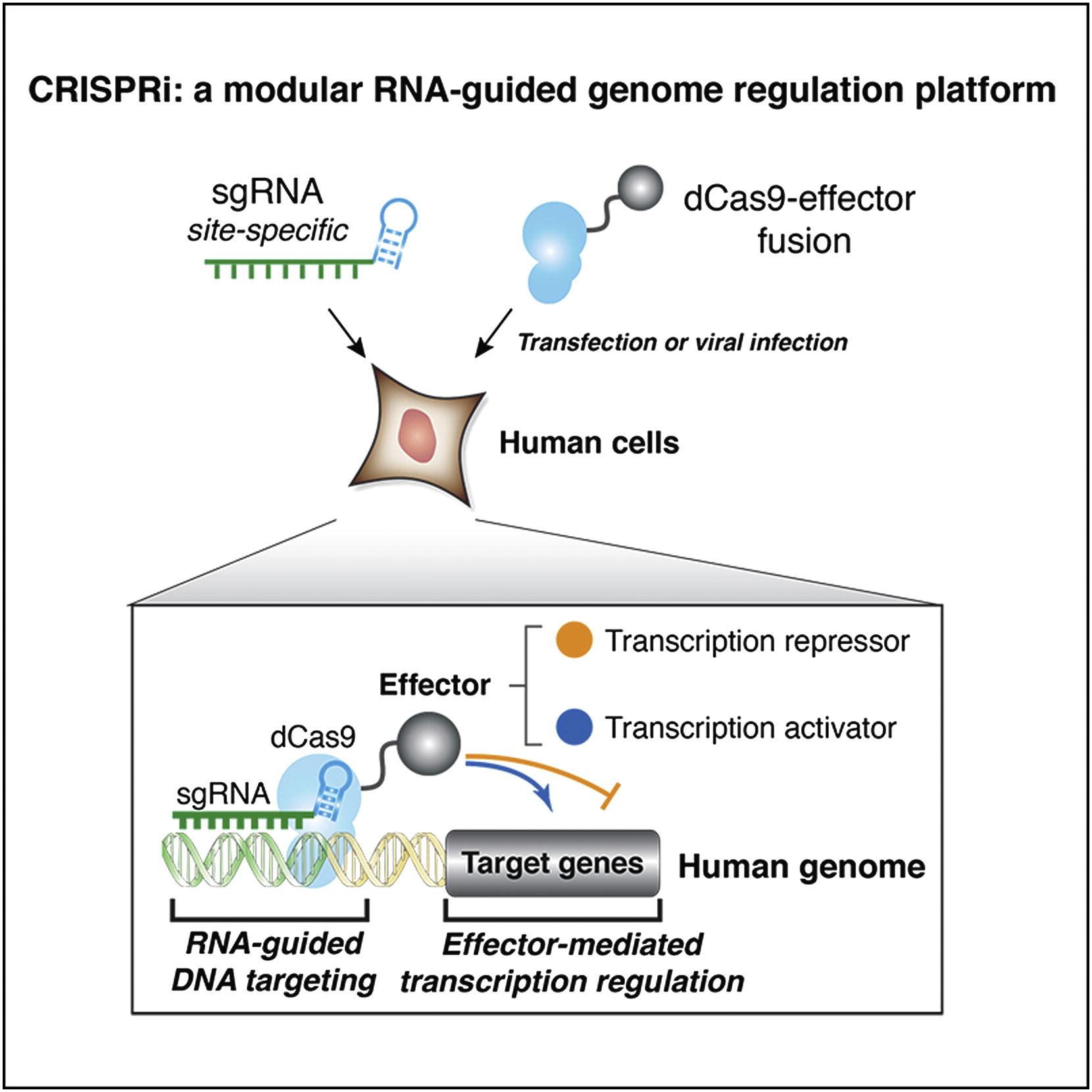图1. CRISPR-dCas9系统调控内源基因的转录激活与抑制(Gilbert LA,et al.,Cell,2013)