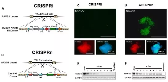 Mandegar等人通过比较Tet-on调控dCas9-KRAB的基因敲低(CRISPRi)与Tet-on调控Cas9的基因敲除(CRISPRn),发现CRISPRi对NANOG的抑制效果更快且更完全。主要是由于CRISPRn的敲除存在很大的效率问题,在iPS细胞系中NANOG受抑制的仅60%–70%的细胞,而CRISPRi能达到99%以上。