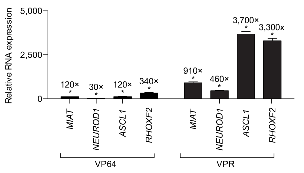 Chavez等人将dCas9与三种激活因子VP64-P65-Rta(VPR,VP64:疱疹病毒转录因子,P65:NFкB信号通路的成员,Rta:EB病毒激活因子)融合,通过特异性靶向目的基因的sgRNA能特异性的提高内源性基因(MIAT, NEUROD1, ASCL1和RHOXF2)的转录水平,起到激活基因的目的。与dCas9-VP64相比效果更加显著。