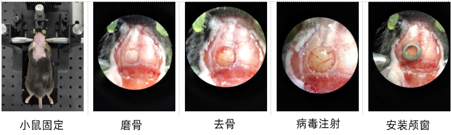 脑科学研究中利用双光子显微镜和基因编码的钙探针(如GCaMP)实现活体钙成像的方式已经被广泛应用。这种研究活体生物神经元功能的方式需要在目标脑区植入颅窗。颅窗植入法即将小鼠颅骨去除后,使用透明玻璃取代颅骨,该方法可以维持大脑正常的生理状态。一方面,可减少激发光透过颅骨的光损失,增加了皮层的成像深度;另一方面,颅窗可以重复长时间使用,对于研究长时间周期的神经元群体或单神经元活动具有很好的效果。