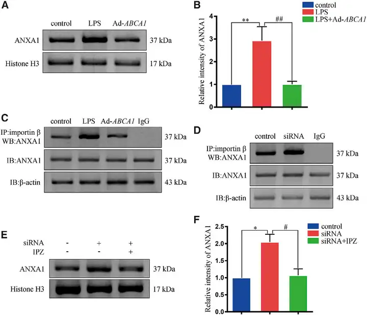 前人研究发现ANXA1核定位与importin β有关。然而,与ABCA1过表达相关的ANXA1核定位的减少是否是由于ABCA1与importin β竞争结合ANXA1尚不清楚。在HEK239细胞中LPS诱导ANXA1的核定位,但被Ad-ABCA1部分阻断。进一步发现,Ad-ABCA1降低ANXA1与importin β的结合;ABCA1表达的减少(siRNA)增加ANXA1与importin β的结合。此外,利用importin β1特异性抑制剂importazole(IPZ)阻断importin β功能。结果发现ABCA1siRNA增加ANXA1核定位,而IPZ部分阻断这种效果。(客户文章,Luo J, Wang S, Zhou Z, et al. Mol Ther Methods Clin Dev. 2021.)