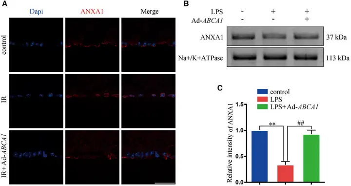 作者利用表达全长人ABCA1基因的重组腺病毒载体(Ad-ABCA1),研究ABCA1过表达对ANXA1亚细胞定位的影响及通过何种机制产生这种影响。Ad-ABCA1处理维持IR(缺血再灌注)后ANXA1的膜定位为探讨ABCA1过表达对ANXA1亚细胞定位的影响,视网膜切片上免疫染色检测ANXA1的表达。研究人员利用DAPI可视化细胞核,如图2所示,IR诱导ANXA1的核定位。而Ad-ABCA1处理,减少了ANXA1核内表达。此外,作者在HEK293细胞的膜提取物中测定ANXA1的表达,发现脂多糖(LPS)处理降低ANXA1表达,而Ad-ABCA1维持ANXA1的表达。
