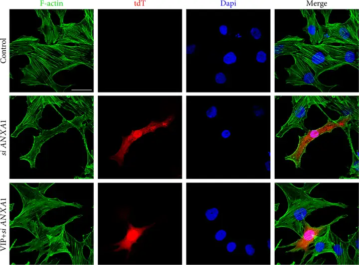 为探究血管活性肠肽(VIP)在调节细胞骨架中的作用,既往研究表明,AnxA1-/-小鼠表现出脑微血管内皮细胞中肌动蛋白细胞骨架扭曲,于是作者利用表达shANXA1的重组腺病毒载体感染人脐静脉内皮细胞(HUVECs),通过鬼笔环肽染色F-肌动蛋白,结果显示AnxA1敲低的HUVECs中观察到F-肌动蛋白纤维更细,VIP处理诱导了清晰的跨细胞F-肌动蛋白纤维的出现,表明肌动蛋白组织更正常。(客户文章,Lou X, Mou Q, Zhao B, et al. Oxid Med Cell Longev. 2021.)
