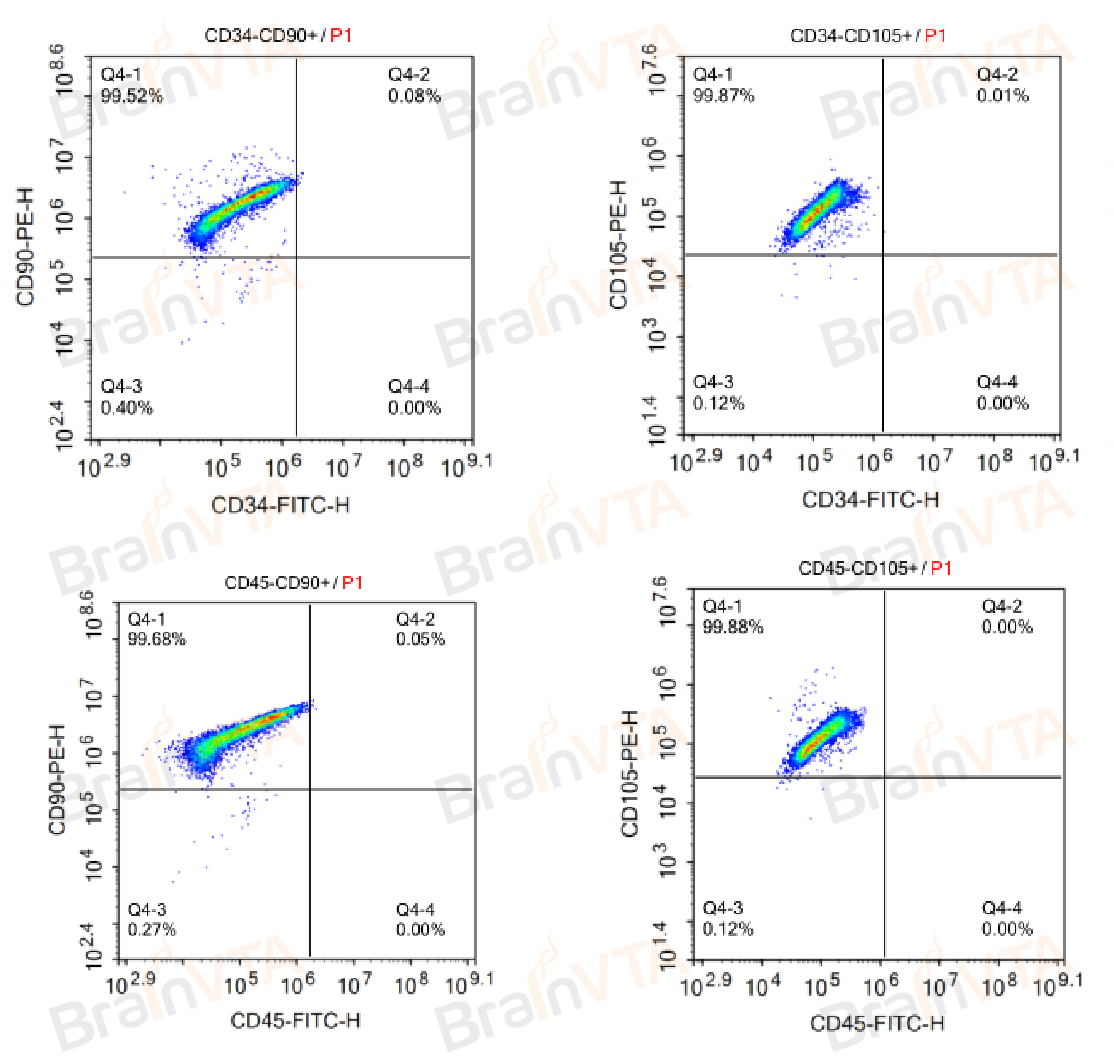 3. 细胞表面标志物鉴定:根据MSC鉴定标准—高表达(≥95%)CD105、CD73、CD90;低表达( ≤2%) CD45、CD34、CD14 或CD11b、CD79α 或CD19、HLA-DR。流式检测结果显示该间充质干细胞表面标志物远远高于MSC鉴定标准。