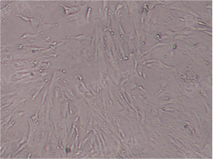 1. 细胞形态学鉴定:贴壁,成纤维细胞类似,呈梭形、不规则三角形、多边形,呈纺锤状生长,细胞中央有卵圆形核,胞质向外伸出2⁃3个长短不同的突起,当细胞密度过大时,可看到细胞成漩涡状排列。