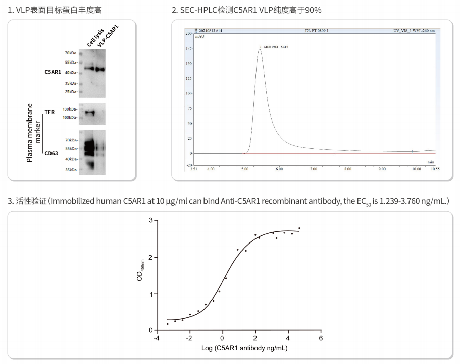 3. 目前已利用该平台生产出系列VLP全长多次跨膜蛋白产品,包括C5AR1、CXCR4、CCR5、CCR8、CD63、Claudin18.2、Cluadin6等多个热门靶点,且均经过活性验证。还可根据客户需求提供目标蛋白定制服务。