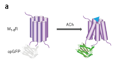 这一系列神经递质探针原理类似,都是基于人源神经递质受体,其原理在于把cpEGFP嵌入特定的神经递质受体,受体与神经递质结合后会引发受体构象改变转换为荧光信号(图1)。