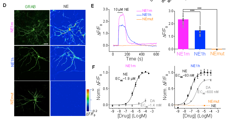 去甲肾上腺素作为一种重要的单胺类神经递质,参与感觉信号的调节、注意力调控、睡眠于觉醒、学习记忆等生理过程,去甲肾上腺素释放或信号传递的受损与一系列的精神疾病和神经退行性病变息息相关。去甲肾上腺素探针包含:NE1m和NE1h两种版本,分别对应高/低亲和力,适用于检测局部突触传递和非局部非突触传递的去甲肾上腺素释放(图4)。