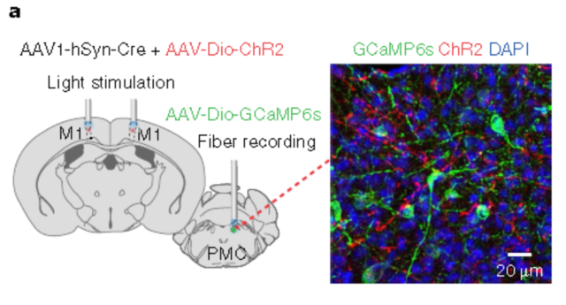 载体:rAAV2/1-hSyn-Cre&rAAV2/9-DIO-hChR2(H134R)-mCherry、rAAV2/9-DIO-GCaMP6s