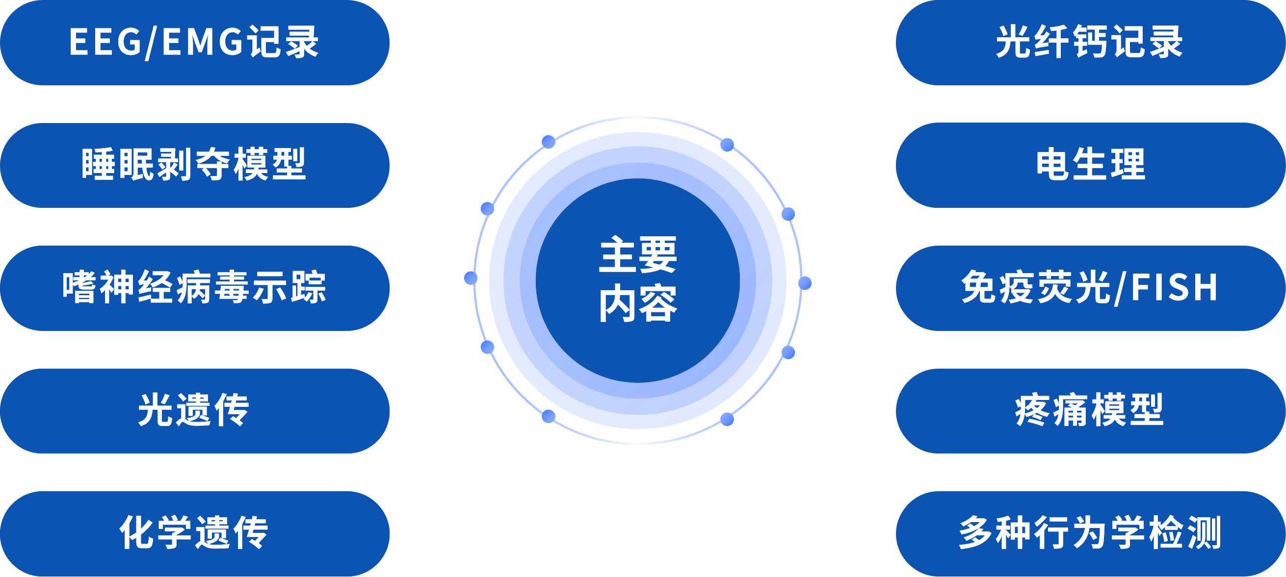 利用EEG/EMG睡眠记录和解析系统不仅可以开展睡眠相关药物的药效评价、同时还能够用于抗癫痫药物、麻醉类药物以及精神类药物的药效研究。通过与化学遗传学、光遗传学、钙信号记录、在体多通道记录等实验技术联用,可以解析中枢核团调控睡眠-觉醒、癫痫、麻醉以及认知等生理性行为的神经环路机制。