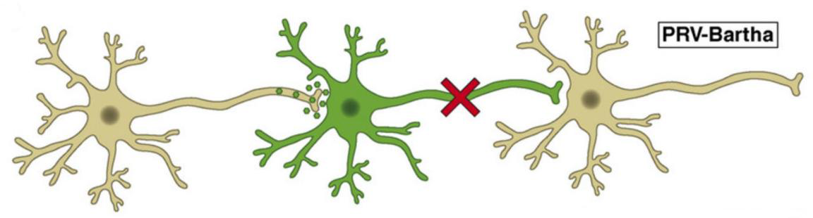 野生PRV的分离株(Becker株)毒性较大,在神经环路传播过程中,既可以顺突触传播,又可以逆突触传播。而PRV的疫苗株(Bartha株)毒性较低,基于PRV Bartha株构建的重组示踪工具病毒,能够严格逆向跨多突触标记神经网络。病毒感染神经细胞后,在胞内复制并表达目的基因,子代病毒运输到突触后,逆向跨突触进入上游神经元,开始新一轮的复制及逆向跨突触传播等过程。