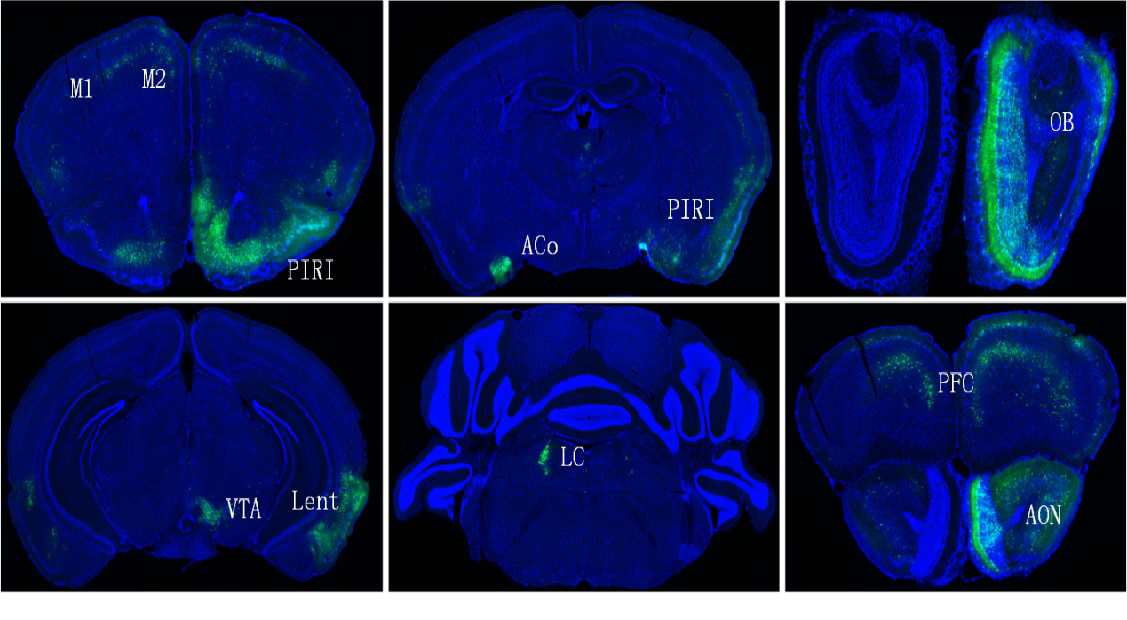 PRV-hUbC-EGFP注射嗅结节(TU)48小时后,逆向跨多突触标记上游脑区,包括M1,M2,Aco,Piri,OB,VTA等区域,表明这些脑区对TU有直接或间接的投射。