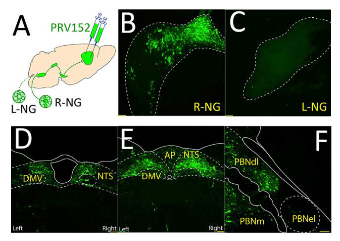 实验方法和结果:将PRV152-GFP注射到小鼠双侧背侧纹状体(DS),观察到PRV152-GFP逆行跨多级到了R-NG、DMV、NTS、AP、PBNdl和PBNm,根据先前的结果进一步验证了R-NG → PBNdl→ SNc通路的存在。