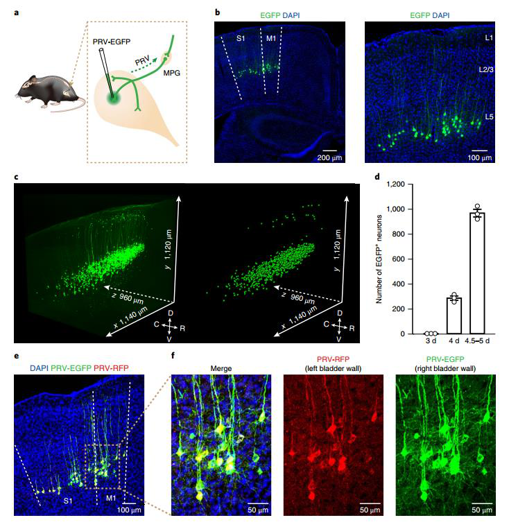 实验方法和结果:将PRV-EGFP注射到小鼠膀胱壁后,在皮层S1/M1 L5锥体神经元观察到EGFP信号。分别将PRV-EGFP与PRV-RFP注射到小鼠右侧和左侧膀胱壁,在皮层S1/M1 L5锥体神经元观察到EGFP和RFP共同表达。表明PRV-EGFP、PRV-RFP无差别逆行跨多级到皮层S1/M1 L5锥体神经元,皮层S1/M1 L5锥体神经元为支配膀胱壁的上游脑神经元群。