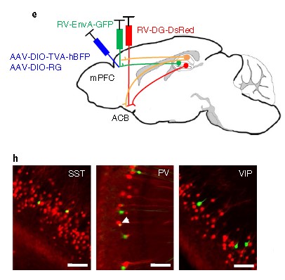 图5 标记海马锥体神经元中同时作用于mPFC和ACB中的GABA能神经元(Sun et al.,Nature neuroscience, 2019)